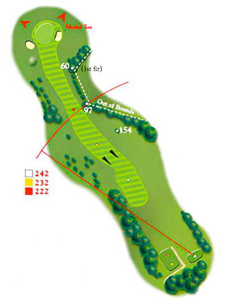 A challenging par 4, slight dogleg right, requiring a drive to the top of the hill, ideally left of centre of the fairway for a clear view of the green with bunkers left and right. Avoid a tee shot leaking right as you will either be blocked out by the hedgerow or worse still – out of bounds. There was originally an orchard sited to the right of the competition tee, adjacent to the farm – hence the name.