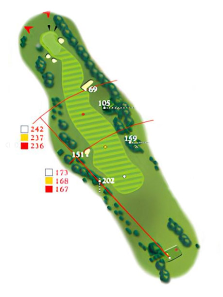 The shortest of the par 4s with trees and a fairly deep bunker to the right and heavy rough to the left, and another bunker, a straight tee shot is a must. A line just inside of the left hand fairway bunker should leave you with a relatively short iron approach, but, once again, try and avoid those greenside bunkers. Twin Woods airfield is situated beyond the course boundary and it was from here that Glenn Miller made his fateful flight in 1944.